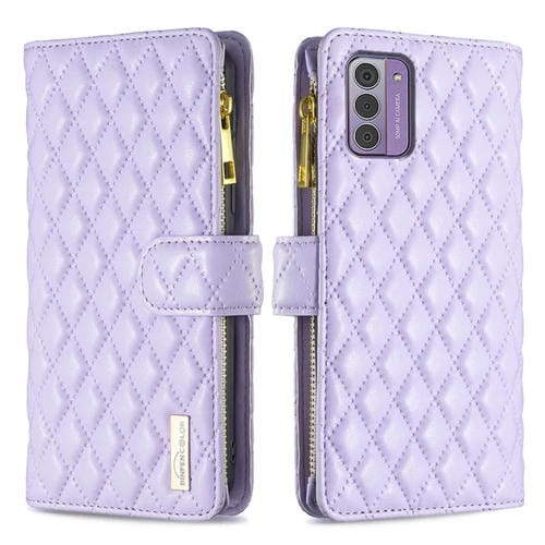 Funda de Cuero con Tapa y Zipper para Nokia G42/G310 (Púrpura) Diamond Lattice Wallet