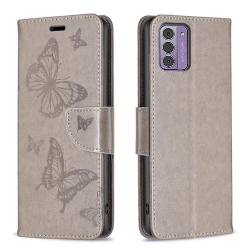 Funda de Cuero de PU para Nokia G42/G310 con Tapa Horizontal Estampado de Dos Mariposas (Gris)