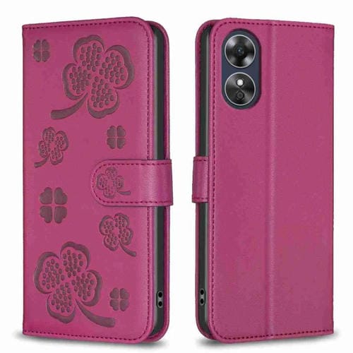 Para Oppo A17 Funda de Cuero con Relieve de Cuatro Hojas (Rojo Rosa)