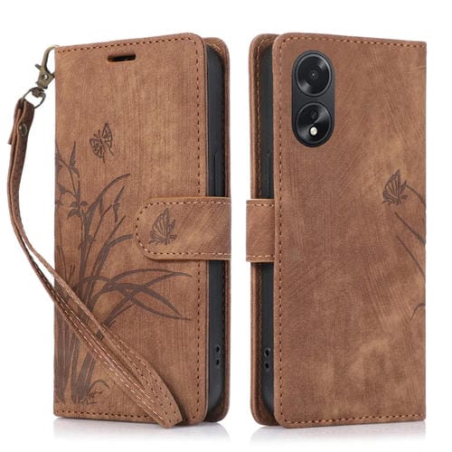 Para Oppo A58 4G Orchid Butterfly Funda de Cuero para Teléfono En Relieve (Marrón)