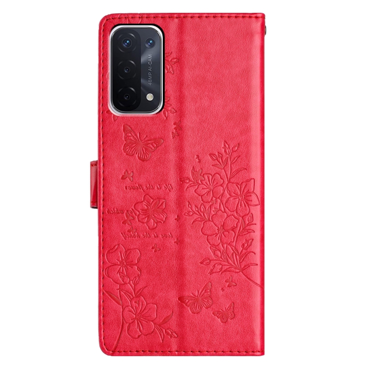 Para Oppo A74 5G / A54 5G Funda para Teléfono de Cuero con Relieve de Flor de Amor y Mariposa (Rojo)