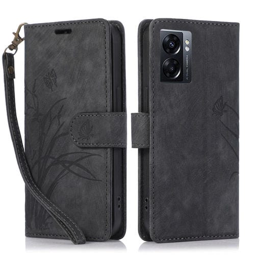 Para Oppo A77 4G / A77S Funda para Teléfono de Cuero con Relieve de Mariposa Orquídea (Negro)