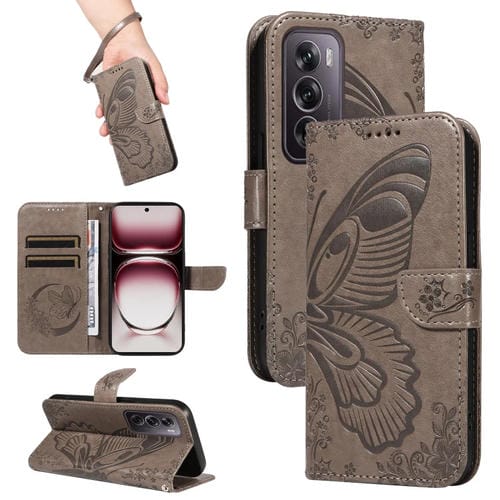 Para Oppo Reno12 Pro 5G Global Swallowtail Butterfly Funda de Cuero En Relieve para Teléfono (Gris)