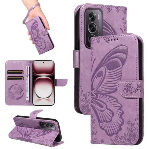 Para Oppo Reno12 Pro 5G Global Swallowtail Butterfly Funda de Cuero En Relieve para Teléfono (Púrpura)