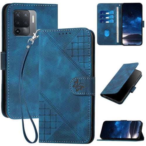 Para Oppo Reno5 F 4G / Reno5 Lite Yx0080 Grid Butterfly Patrón En Relieve Funda de Cuero con Tapa para Teléfono con Cordón (Azul Oscuro)