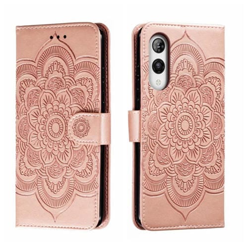 Funda de Cuero para Rakuten Hand 5G con Patrón Sun Mandala en Relieve (Oro Rosa)