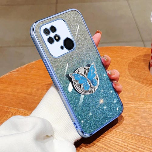Para Redmi 10C Funda para Teléfono de TPU con Soporte de Mariposa con Brillo Degradado Plateado (Azul Sierra)