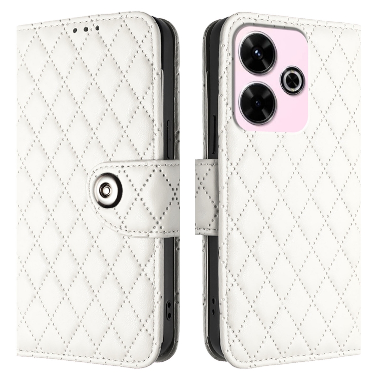 Para Redmi 13 4G / Note 13R Funda para Teléfono con Tapa de Cuero con Textura Rómbica y Cordón (Blanco)