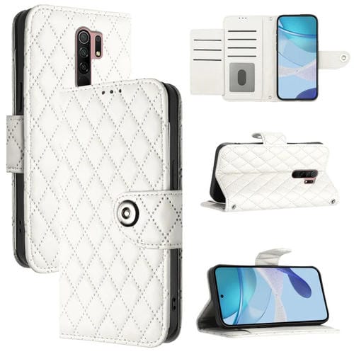 Para Redmi 9/9 Prime India Funda para Teléfono con Tapa de Cuero con Textura Rómbica y Cordón (Blanco)