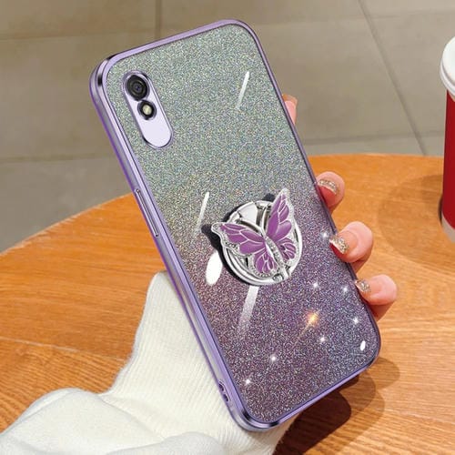 Para Redmi 9A Funda para Teléfono de TPU con Soporte de Mariposa con Brillo Degradado Plateado (Púrpura)