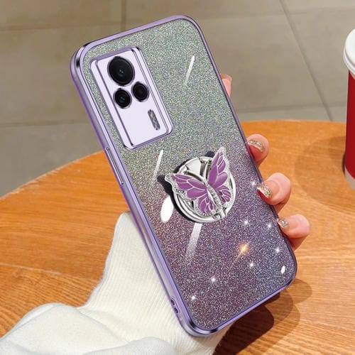 Para Redmi K60E Estuche para Teléfono de TPU con Soporte de Mariposa con Brillo Degradado Plateado (Púrpura)