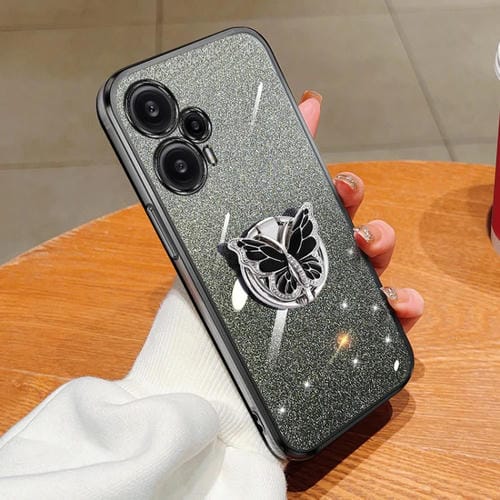 Para Redmi Note 12 Funda para Teléfono de TPU con Soporte de Mariposa con Brillo Degradado Turbo Plateado (Negro)
