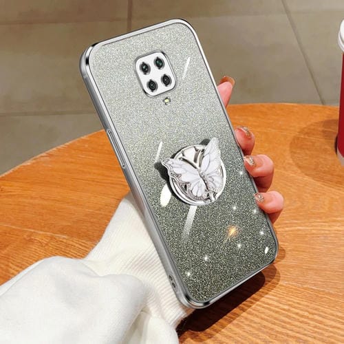 Para Redmi Note 9S Funda para Teléfono de TPU con Soporte de Mariposa con Brillo Degradado Plateado (Plata)