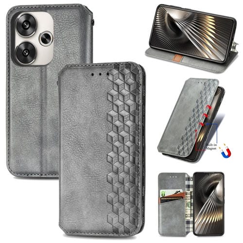 Para Redmi Turbo 3 5G Cubic Grid Funda de Teléfono de Cuero Magnético Prensado (Gris)