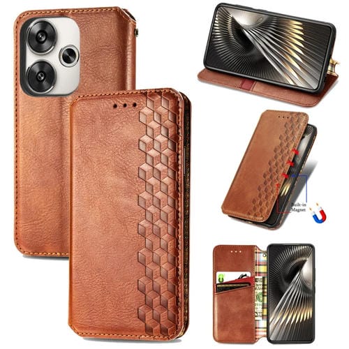 Para Redmi Turbo 3 5G Cubic Grid Funda de Teléfono de Cuero Magnético Prensado (Marrón)