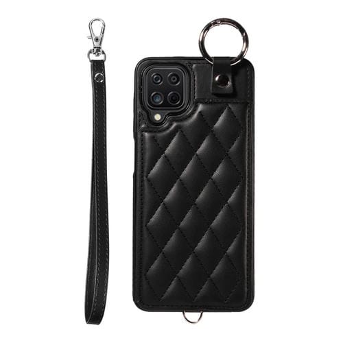 Estuche para Teléfono Samsung Galaxy A12 4G con Bolsa para Tarjetas Textura Rómbica y Cordón Corto (Negro)