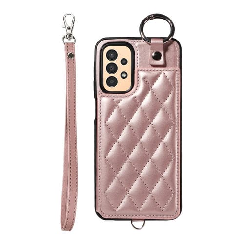 Estuche para Teléfono Samsung Galaxy A13 4G 5G con Bolsa para Tarjetas Textura Rómbica y Cordón Corto (Oro Rosa)