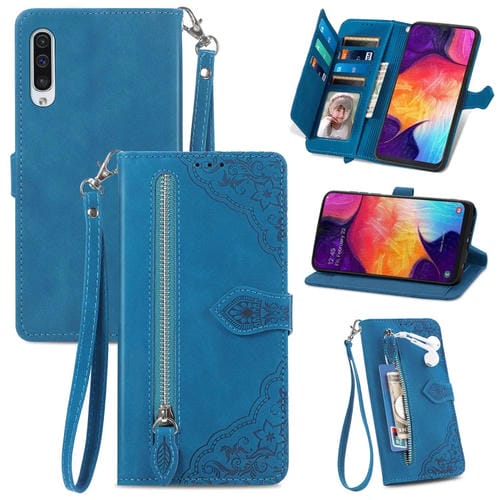 Funda de Cuero para Samsung Galaxy A15 con Cremallera y Flores en Relieve (Azul)
