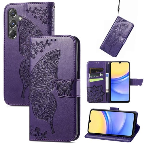 Funda para Teléfono Samsung Galaxy A15 Cuero Relieve Flor de Amor y Mariposa (Púrpura)