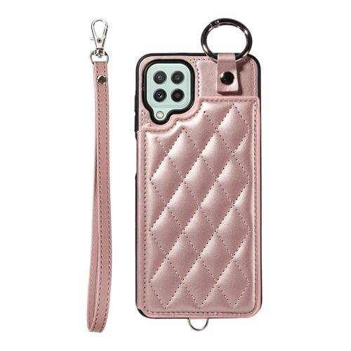 Estuche para Teléfono Samsung Galaxy A22 4G con Bolsa para Tarjetas Textura Rómbica y Cordón Corto (Oro Rosa)