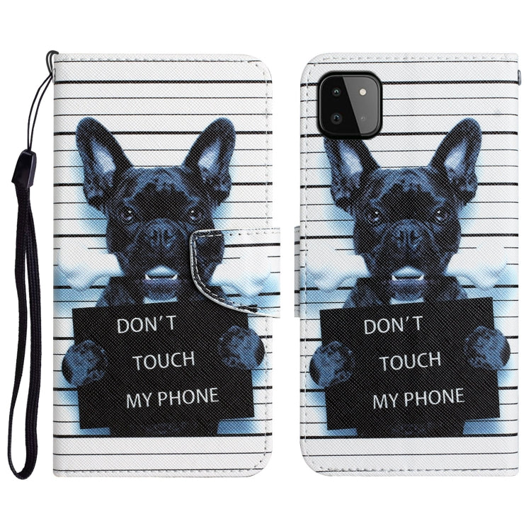 Para Samsung Galaxy A22 5G Caja de teléfono de cuero con dibujo coloreado (perro negro)
