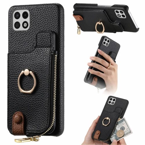 Funda para Samsung Galaxy A22 5G Litchi Leather Oil Edge Ring Zipper Wallet Back (Negro)