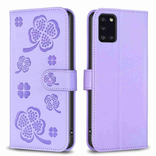 Funda de Cuero Samsung Galaxy A31 con Relieve de Cuatro Hojas (Púrpura)