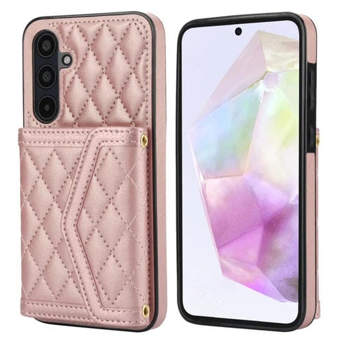 Estuche para Teléfono Samsung Galaxy A35 5G con Bolsa para Tarjetas Textura Rómbica Empalme y Cordón Largo (Oro Rosa)