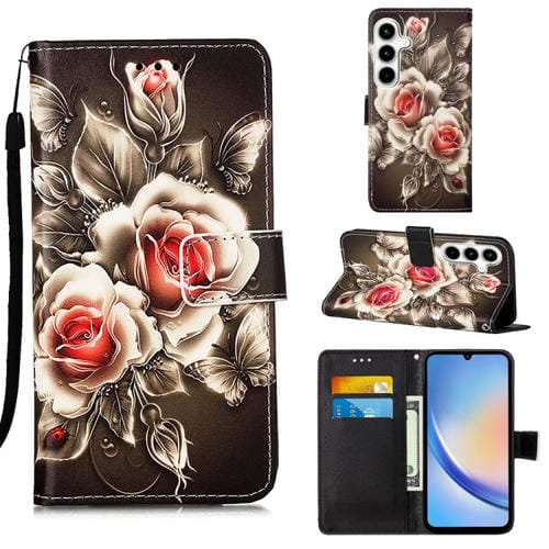 Funda para Teléfono Samsung Galaxy A35 5G Cuero Tejido Liso Patrón Dibujo Rosas en Negro