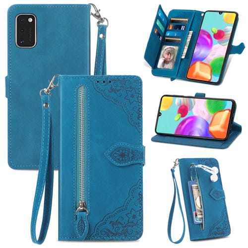 Funda para Samsung Galaxy A41 Cuero con Cremallera y Flores en Relieve (Azul)