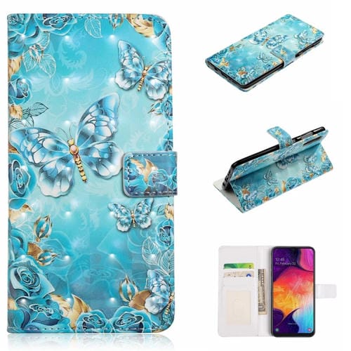 Funda de Cuero Samsung Galaxy A50 Dibujo 3D En Relieve al Óleo (Mariposas Azules)