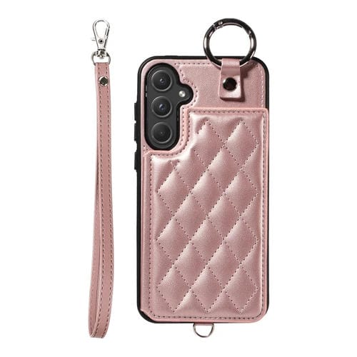 Estuche para Teléfono Samsung Galaxy A55 5G con Bolsa para Tarjetas Textura Rómbica y Cordón Corto (Oro Rosa)