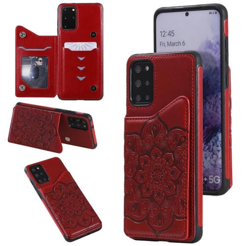Estuche protector Samsung Galaxy S20 + con patrón Flower en relieve, soporte, ranuras para tarjetas y marco de fotos (Rojo)
