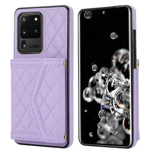 Estuche para teléfono Samsung Galaxy S20 Ultra Empalme con Textura Rómbica y Bolsa para Tarjetas con Cordón Largo (Púrpura)