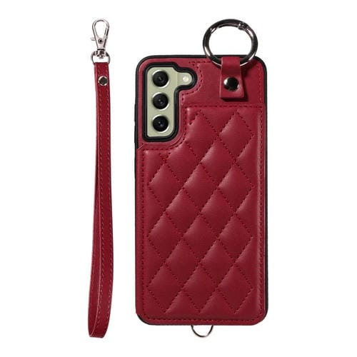 Estuche para Teléfono Samsung Galaxy S21 FE 5G con Bolsa para Tarjetas Textura Rómbica y Cordón Corto (Rojo Vino)