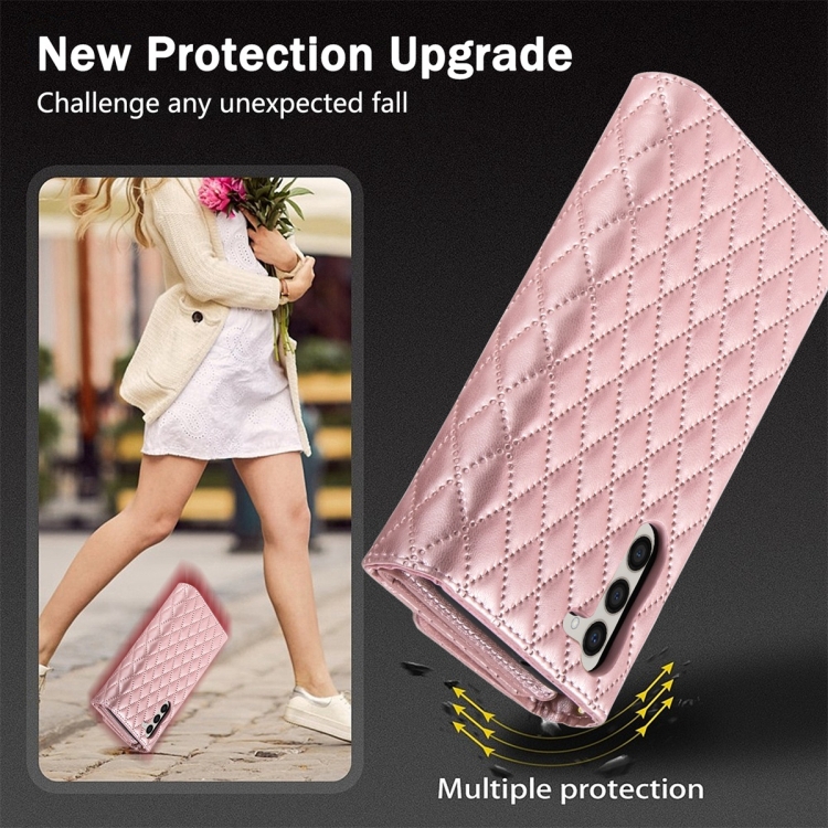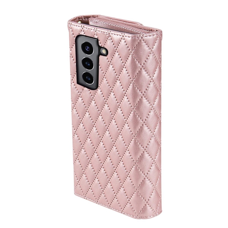 Funda para Teléfono Samsung Galaxy S21 FE 5G Cuero Rómbico con Billetera MultiTarjeta y Cremallera (Oro Rosa)