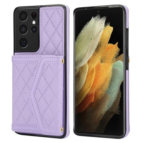 Estuche para Teléfono Samsung Galaxy S21 Ultra 5G con Bolsa para Tarjetas Textura Rómbica y Cordón Largo (Púrpura)