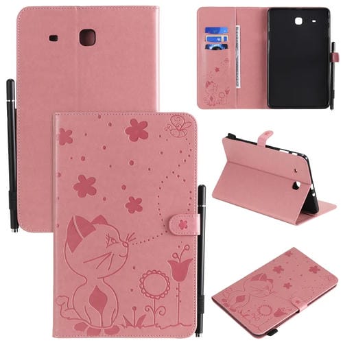 Funda protectora para Samsung Galaxy Tab E9.6 T560 con patrón Cat Bee, estampado en relieve, tapa horizontal, soporte, ranuras para tarjetas y bolígrafo (Rosa)