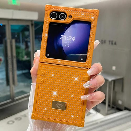 Estuche para teléfono Samsung Galaxy Z Flip3 5G PC a prueba de golpes con diamantes completos y logotipo (Naranja)