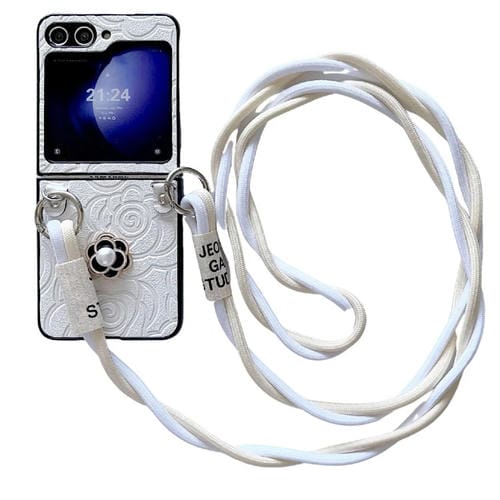 Funda Protectora Samsung Galaxy Z Flip4 5G Impression Camellia Pattern con Cordón Largo (Blanco)
