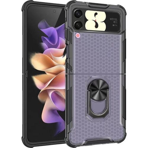 Estuche para teléfono Samsung Galaxy Z Flip4 Honeycomb PC + TPU a prueba de golpes con soporte para anillo (Negro)