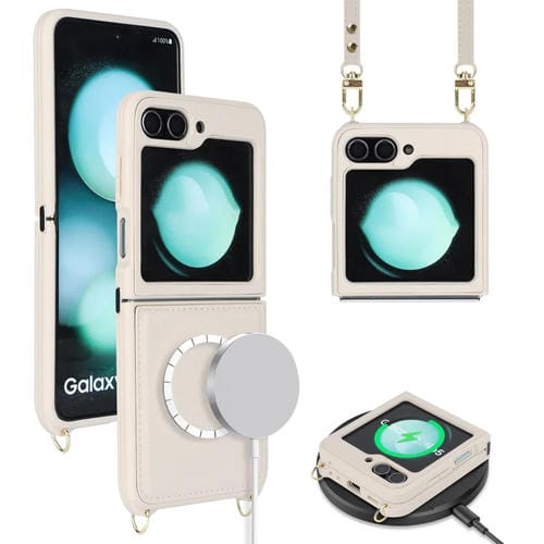 Estuche para Teléfono Samsung Galaxy Z Flip5 5G Crossbody R20 Magsafe de Cuero con Textura (Blanco)