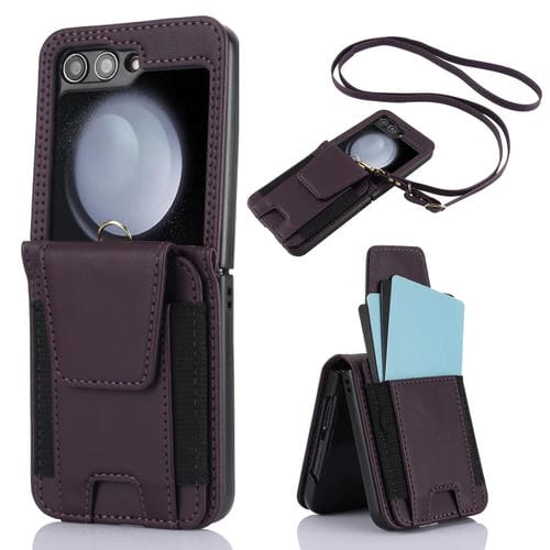 Estuche plegable Samsung Galaxy Z Flip5 con ranuras para tarjetas y cordón largo (Púrpura Oscuro)
