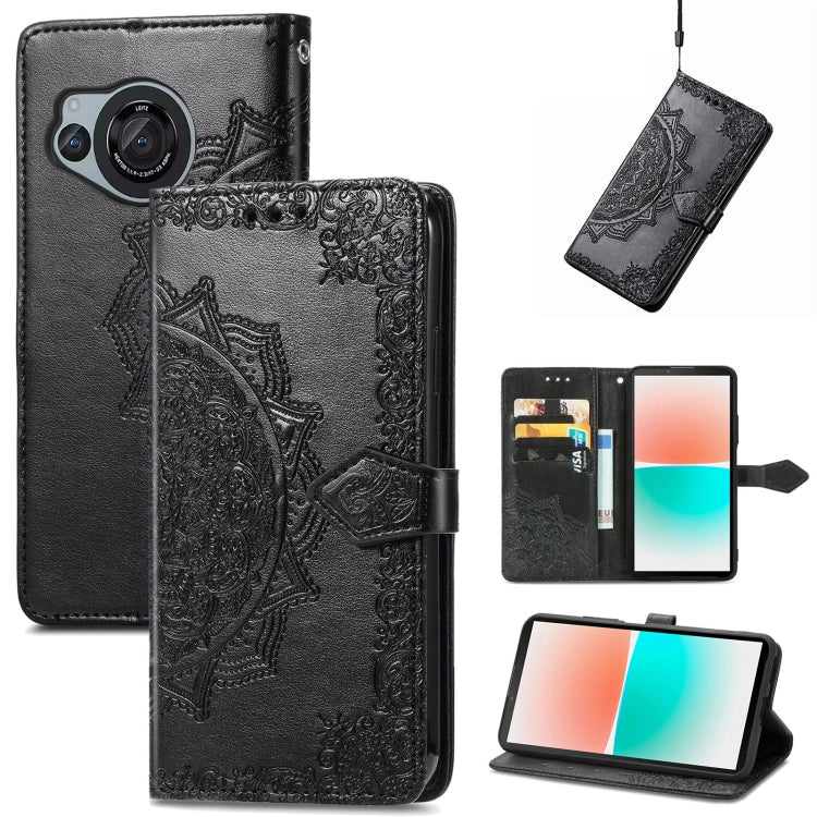 Funda de Cuero para Sharp Aquos R8 Mandala Flower con Relieve (Negro)