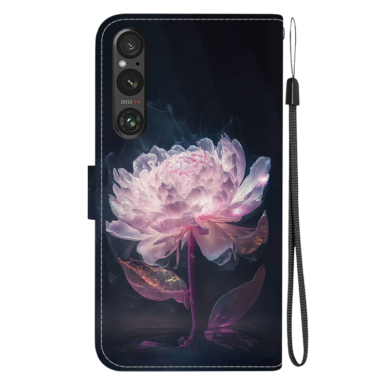 Estuche de Cuero para Sony Xperia 1 V (2023) con Dibujo Coloreado y Textura de Cristal (Peonía Púrpura)