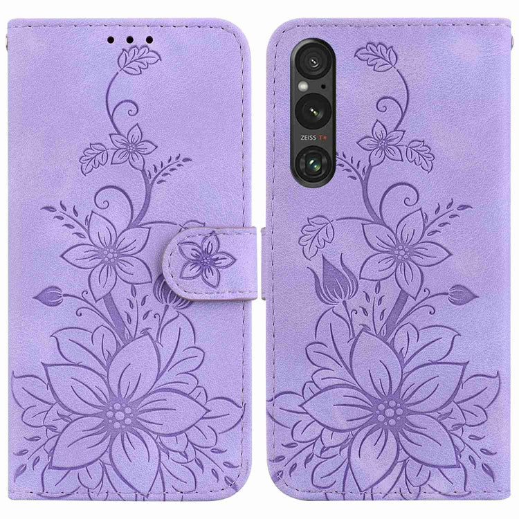 Estuche de Cuero para Sony Xperia 1 V Lily con Relieve (Púrpura)
