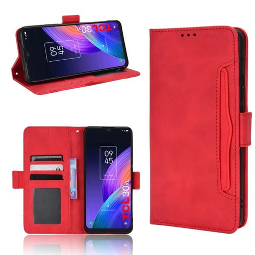 Funda de Cuero para TCL 30 XL Skin Feel con Textura Becerro y Ranuras para Tarjetas (Rojo)