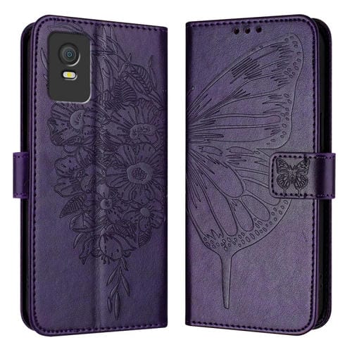 Funda de Cuero para TCL 403 con Mariposa en Relieve (Púrpura Oscuro)