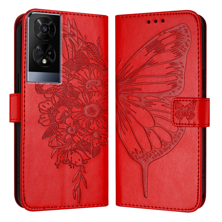 Funda de Cuero para TCL 50Xe 5G con Mariposa en Relieve (Rojo)