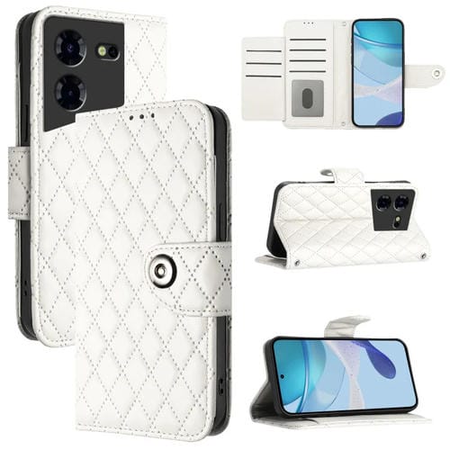 Funda de Cuero para Tecno Pova 5 4G con Tapa Textura Romboidal y Cordón (Blanco)